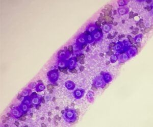 MCTは、細針吸引(FNA)による細胞診(写真1)で診断できますが、組織学的グレードは判定できません。しかし、顆粒の量、細胞の大きさや核の異型性の程度によってある程度まで悪性度の判定が予想できる場合もあります。また、細胞診検査と同時に、c-kit遺伝子変異の検査も同時に行います。