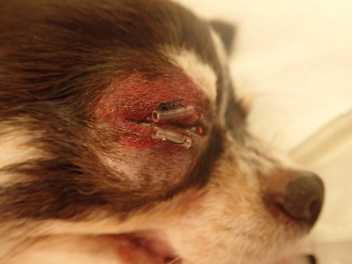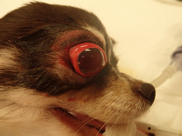 眼球脱出は外傷性に生じて、原因の多くは交通事故や動物同士の喧嘩です。
